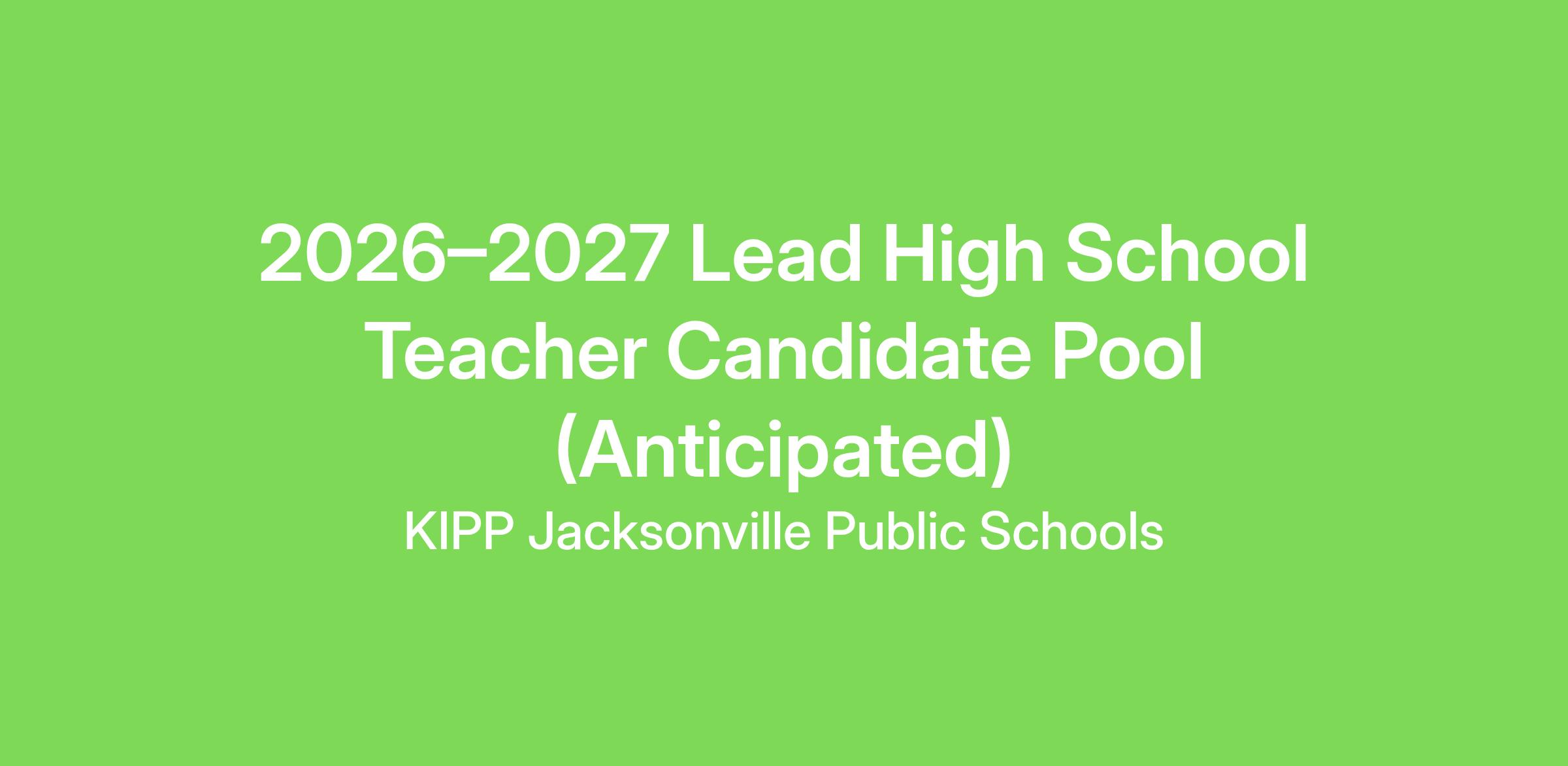 KIPP Jacksonville Public Schools seeks high school teachers for our 9th-12th grade classrooms in the 2026-2027 school year. We are building a candidate pool for Lead High School teachers anticipated for the 2026–2027 school year across our network. While this is not a guarantee of placement, selected candidates in the pool may be invited to interview when openings arise.