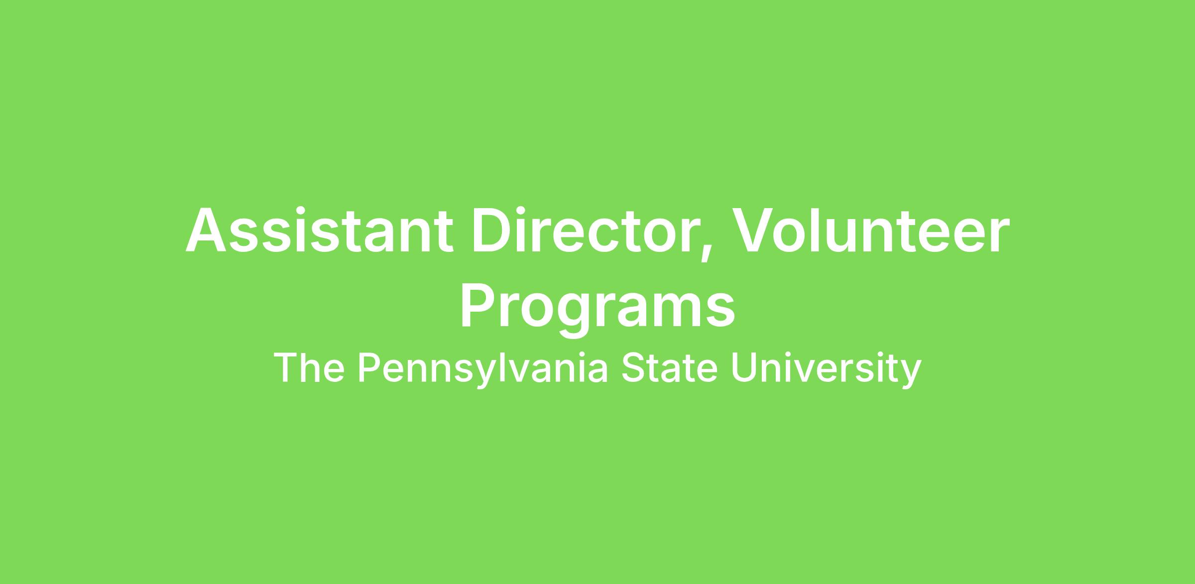 Penn State is currently seeking a Assistant Director in supporting the Office of Volunteer Programs to assist in the recruitment, engagement, and management of volunteers supporting the Office of University Development's fundraising efforts. As a member of the Division of Development and Alumni Relations, you can play an integral role in Penn State’s future and contribute to one of the most successful fundraising and alumni relations operations in the country.