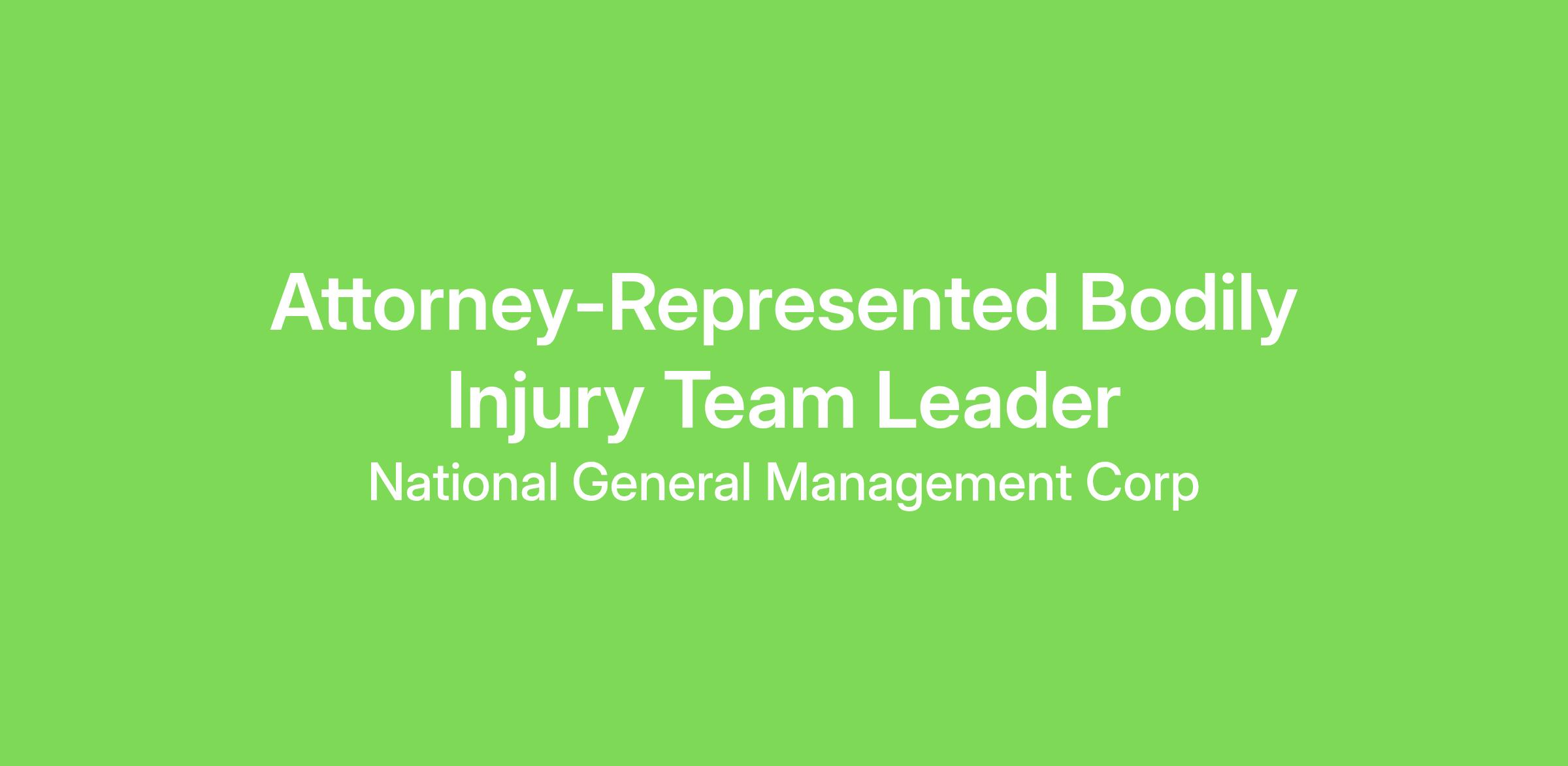 The Bodily Injury Team Leader role will be managing a team of attorney-represented injury adjusters for our west coast claims team. Candidates must be able to work Pacific time zone hours.• Frequently participates in special projects as a subject matter expert