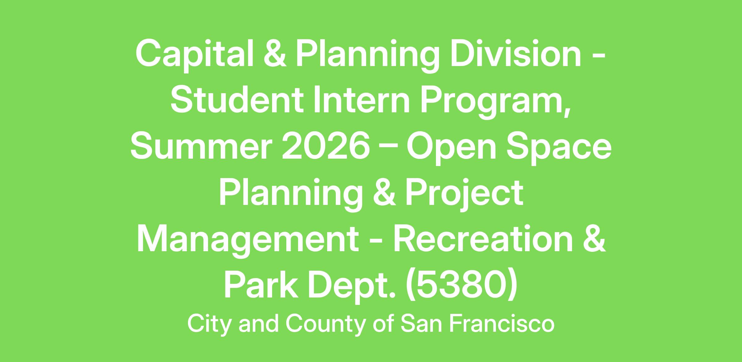 The San Francisco Recreation and Park Department is seeking student interns in planning, landscape architecture, engineering, and related disciplines, to support our Capital and Planning Division for a year-long (or longer) part-time internship. This is a great opportunity to work during the summer and the following school year as an integral part of our Division.