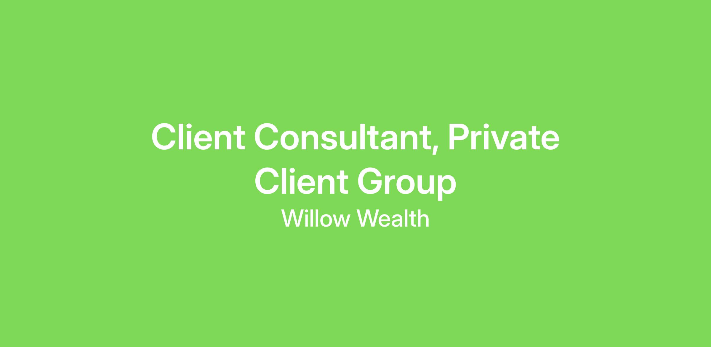 Willow Wealth is hiring a Client Consultant for our Private Client Group (PCG). The PCG team is focused on supporting high net worth individuals and corporate executives interested in investment opportunities offered on Willow Wealth. You will be responsible for growing and managing relationships with existing key clients and engaging with potential new members.