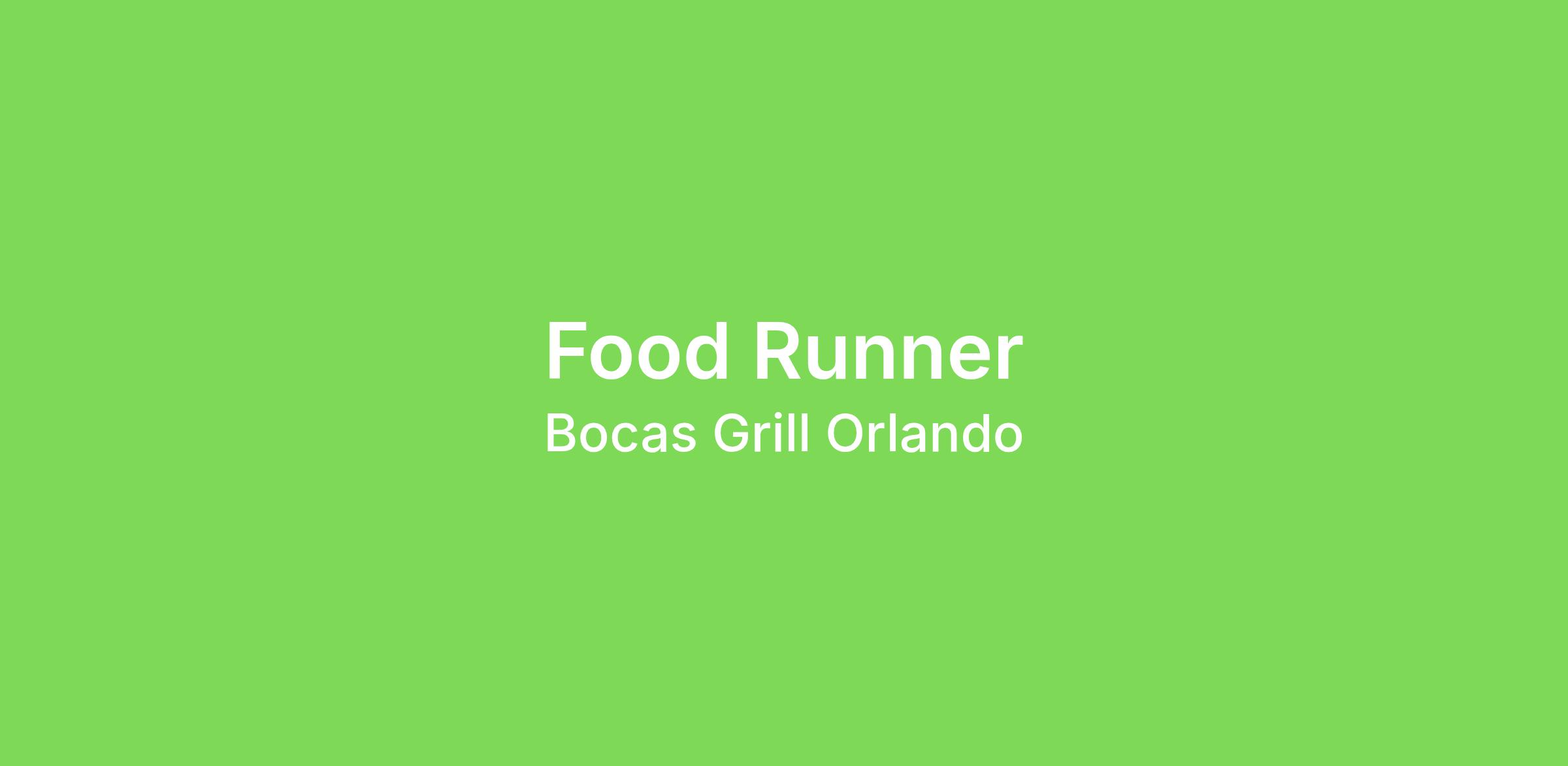 Bocas's Grill & Bar en Orlando, FL está buscando un food runner para unirse a nuestro 50 persona equipo fuerte . Estamos ubicados en 7600 Dr Phillips Blvd #22 . Nuestro candidato ideal es auto conducido , puntual y de confianza .