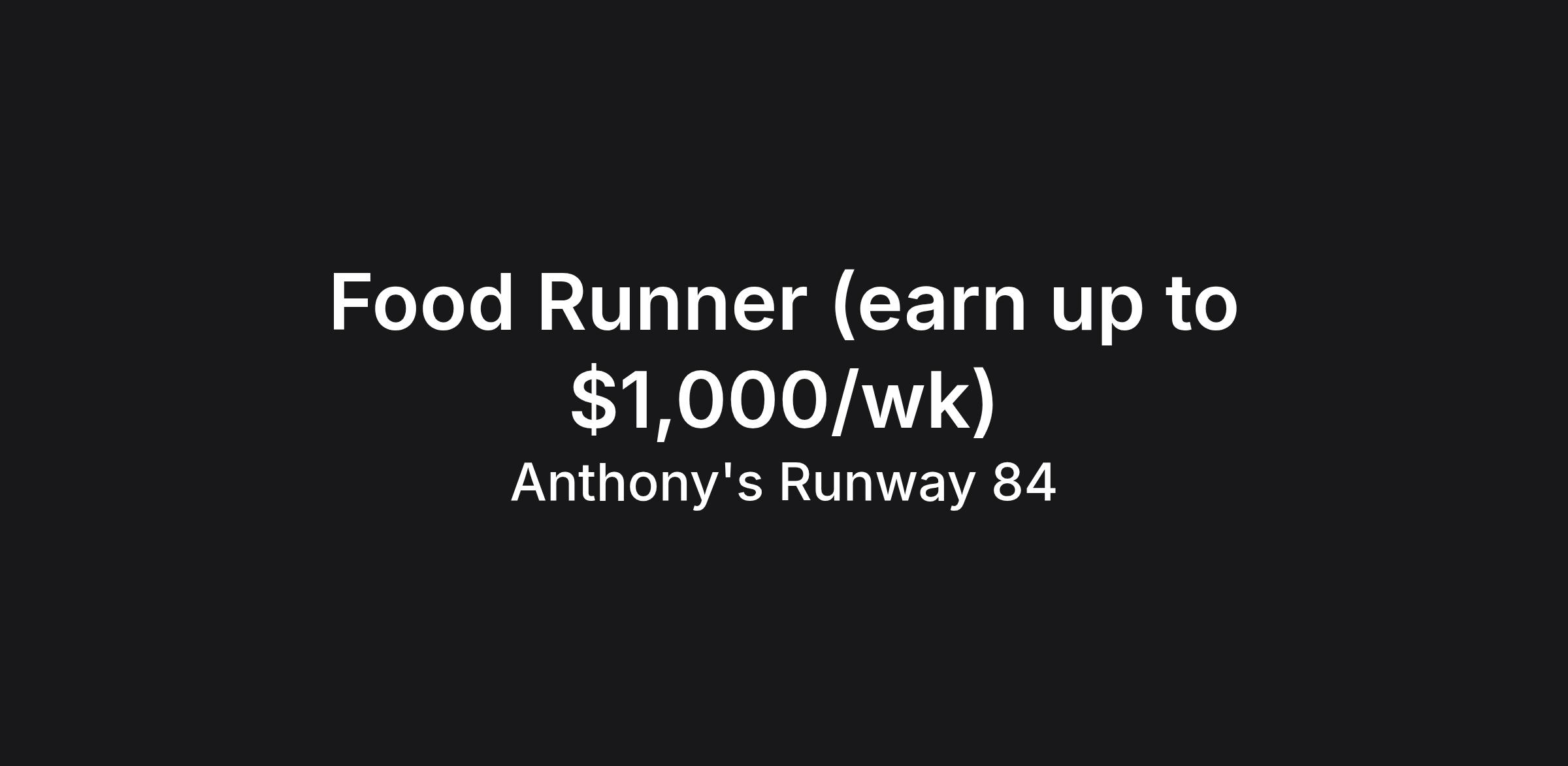 Runway 84 is seeking to hire Food Runner to join our team! Up to $1,000+ per week! ($7.98/hour + Tips)