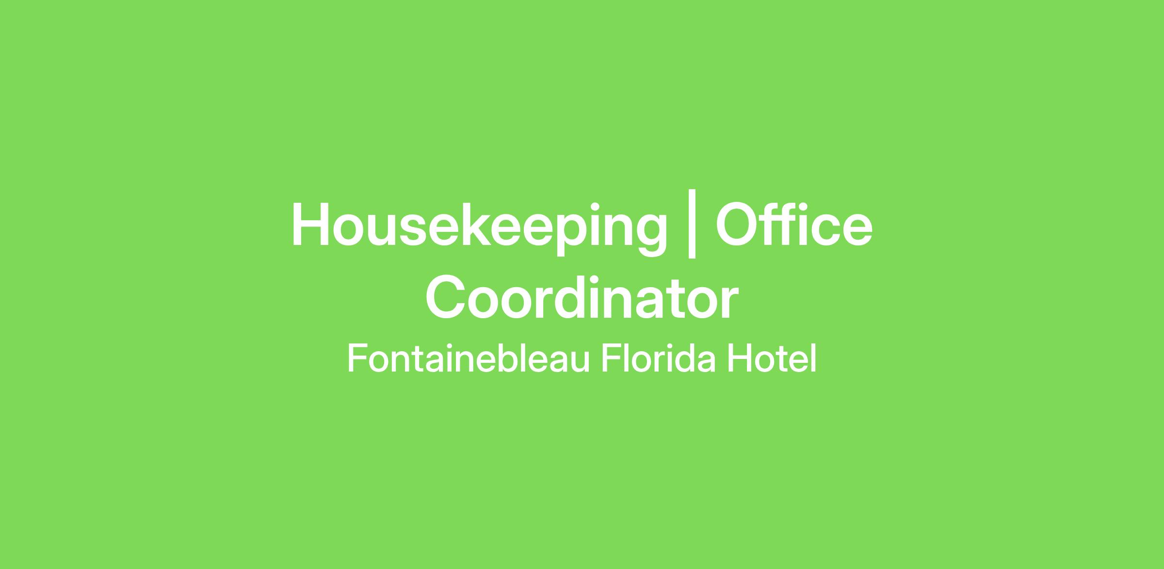 The Housekeeping Office Coordinator will be responsible for a wide variety of administrative tasks to track and follow-up on issues and projects related to maintaining the quality and integrity of our guest rooms and condominiums.