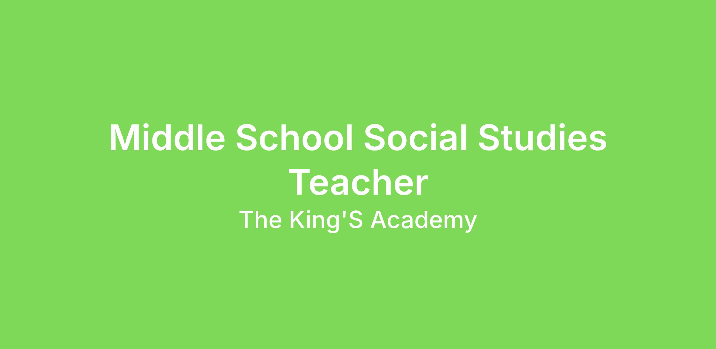 An experienced teacher is needed to teach Middle School Social Studies courses. The successful candidate should have at minimum three years of teaching experience in a classroom setting. Minimum of a bachelor’s degree is required. Advanced degree is preferred. Must hold or be willing to obtain teacher certification in the subject area. The teacher will prayerfully help students learn attitudes, skills, and subject matter that will contribute to their development as mature, able, responsible, disciplined Christians who exhibit knowledge and wisdom in submission to God. The successful candidate will possess strong relational skills and serve as an advocate for students. The teacher will work closely with the Middle School office. The teacher will ascribe to and perform all duties in accordance with The King’s Academy’s Statement of Faith and Employee Role Model Standards.