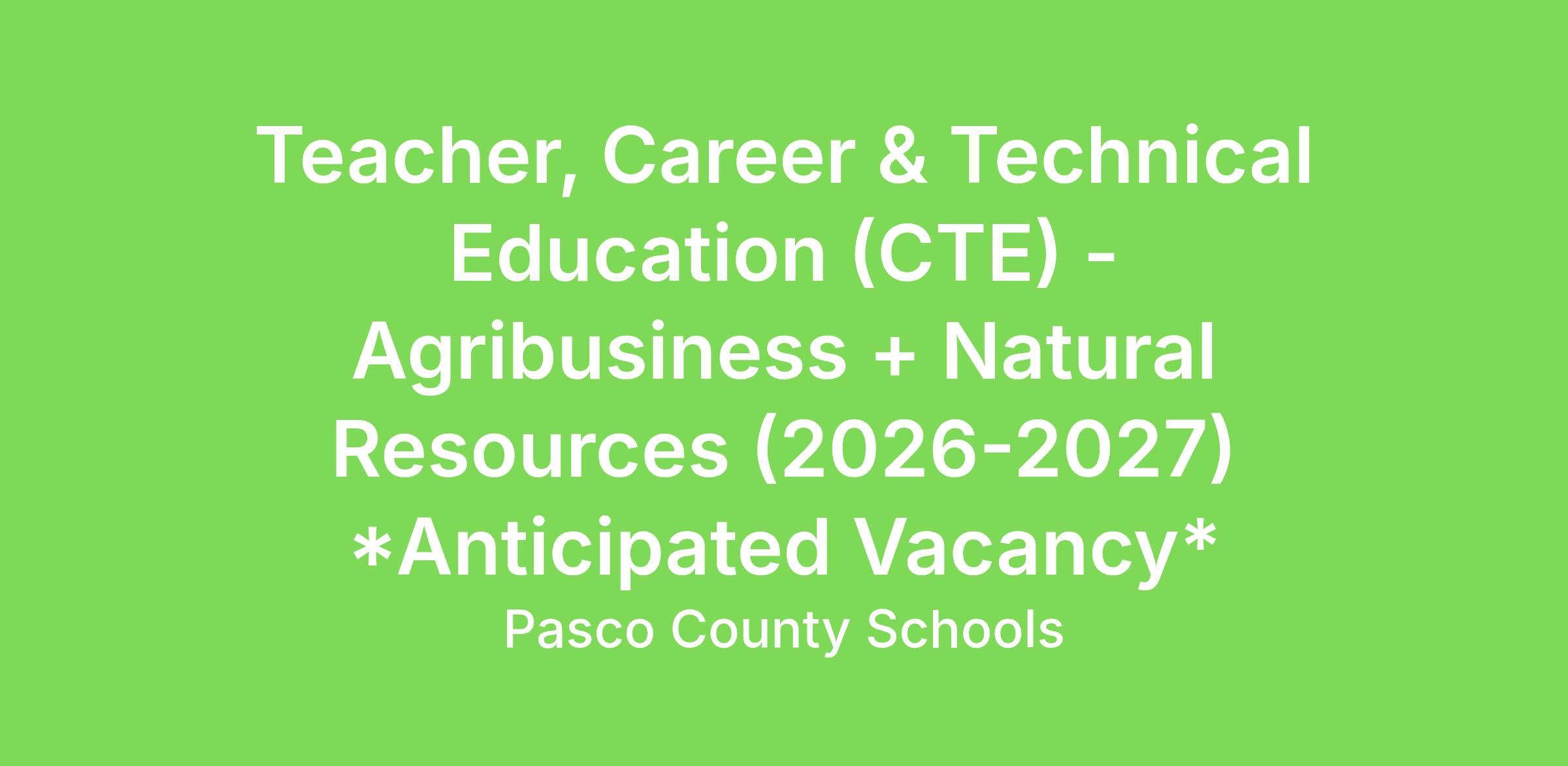 Teacher, Career & Technical Education (CTE) - Agribusiness + Natural Resources (2026-2027) *Anticipated Vacancy*