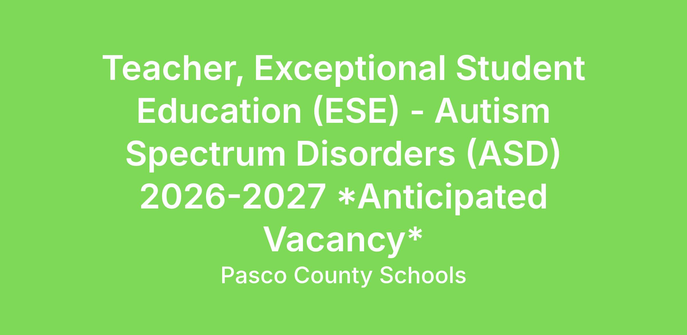 Teacher, Exceptional Student Education (ESE) - Autism Spectrum Disorders (ASD) 2026-2027 *Anticipated Vacancy*