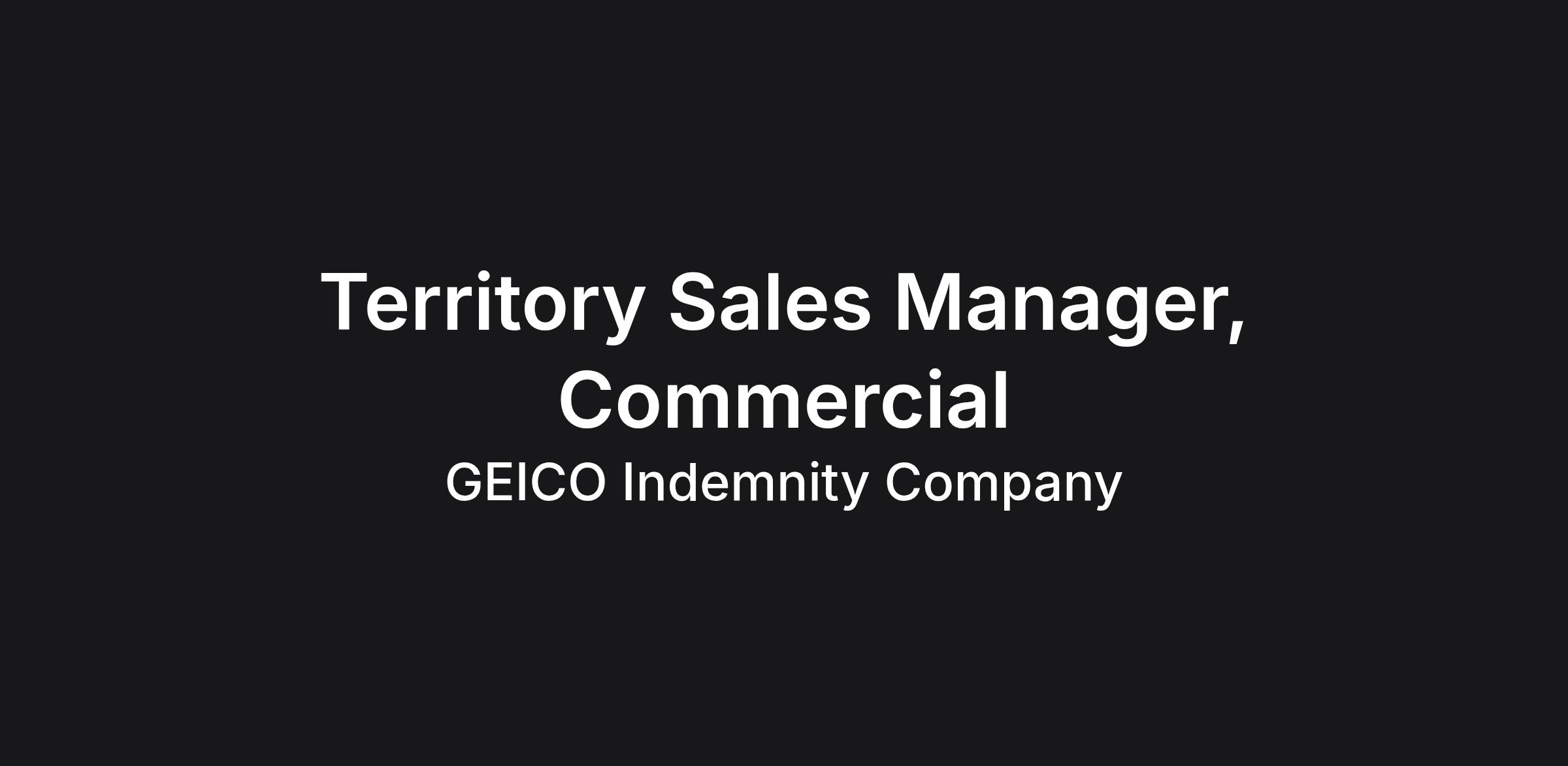 We are seeking a Territory Sales Manager, Commercial position, who will be responsible for growth of agency relationships to increase profits of GEICO and GEICO-affiliated products within an assigned area of responsibility. OVERSEES the development and execution of policies that cater to increasing agency relationships.